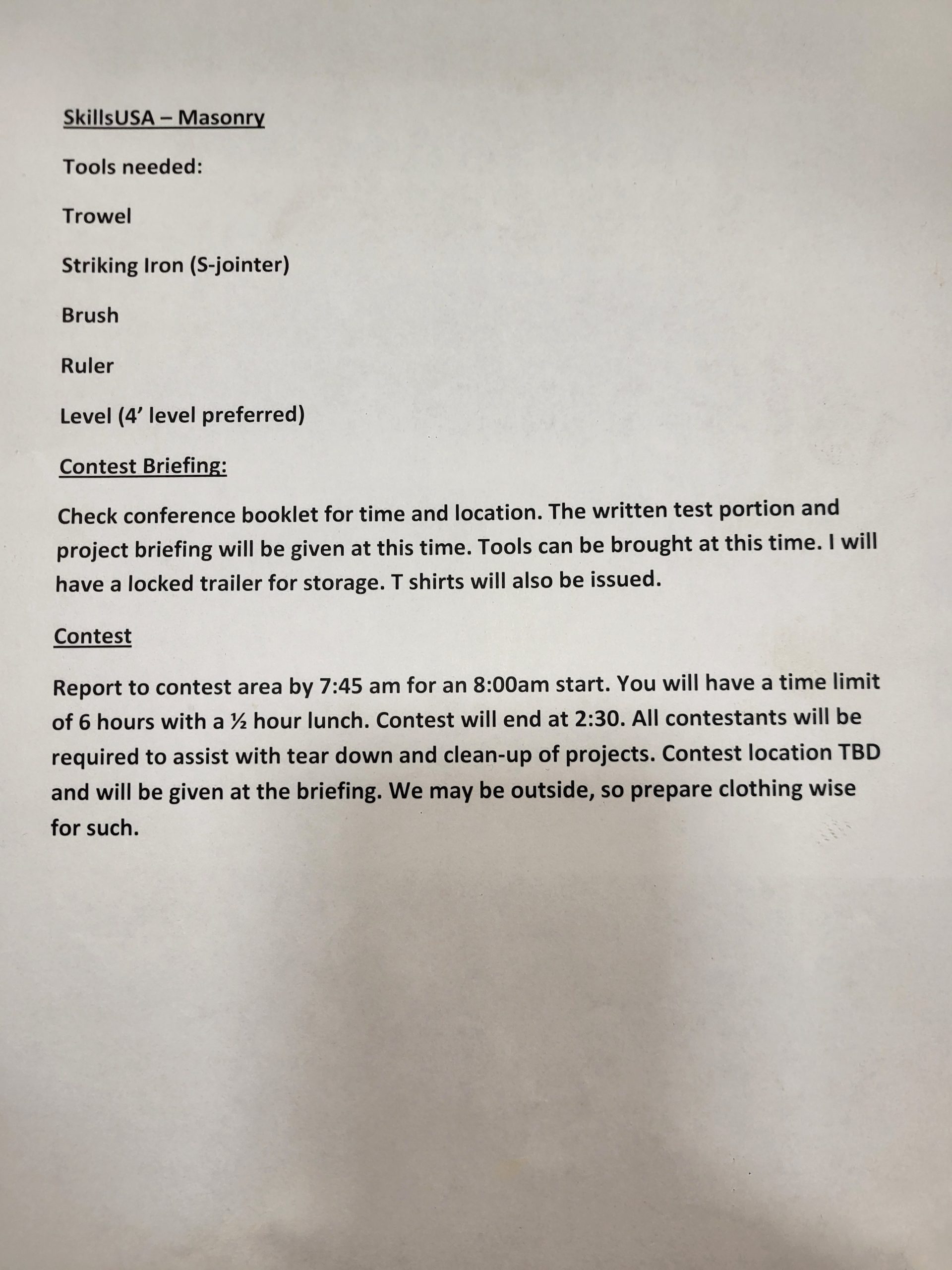 | Welding | individual | X | SKILL | YES | Held at Madison College – Bussing provided, watch schedule. All Welders will eat lunch at Madison College, plan bussing to accommodate lunch schedule. Check our Welding Website, for Prints, Schedule and results will be posted after event is complete. | |